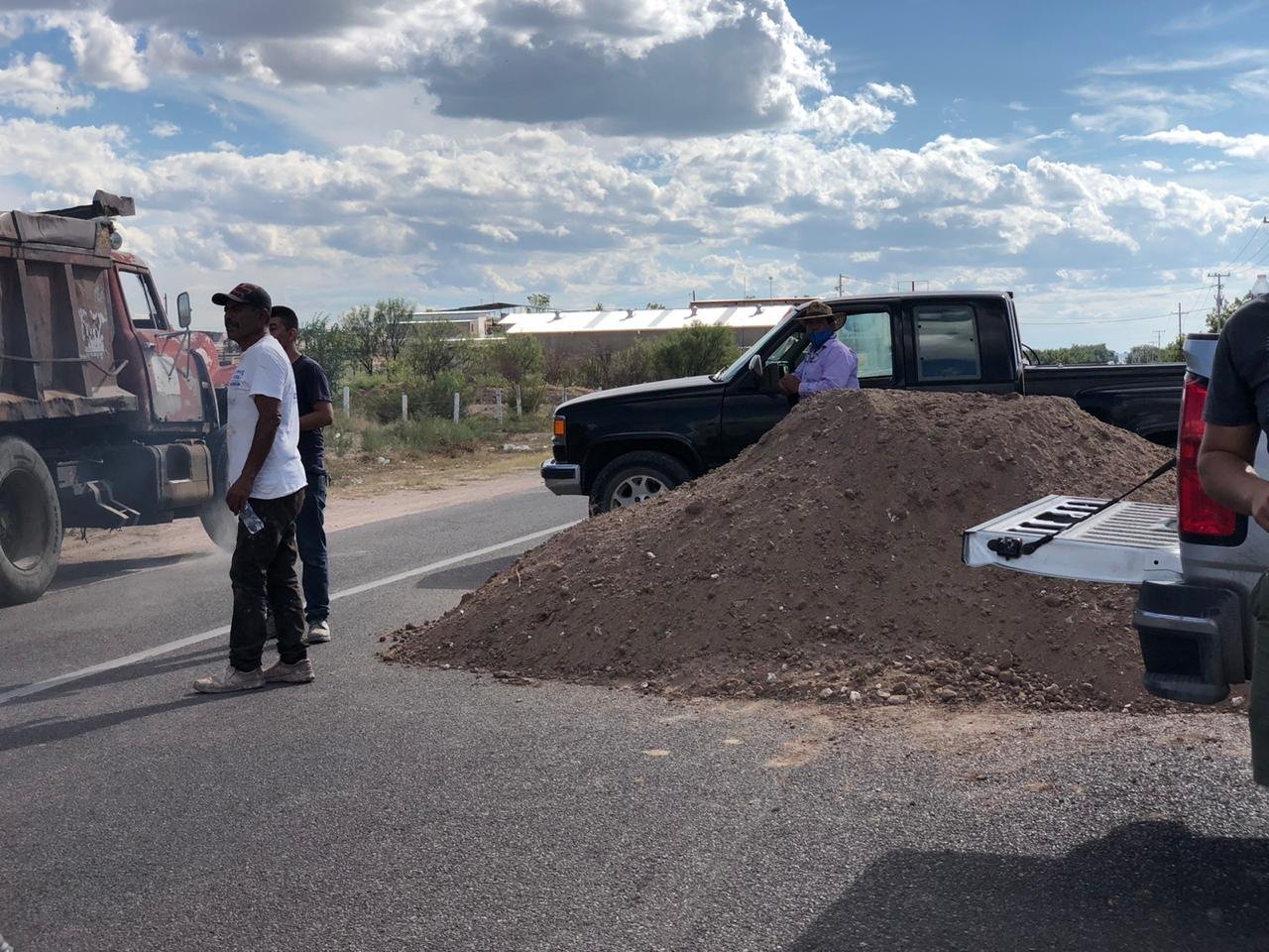 Manifestantes ciudadanos se unieron a la lucha de los agricultores de la región a través de colocar bultos de tierra en el paso del denominado Rosal, en el inicio de la carretera estatal con rumbo a San Francisco de Conchos.