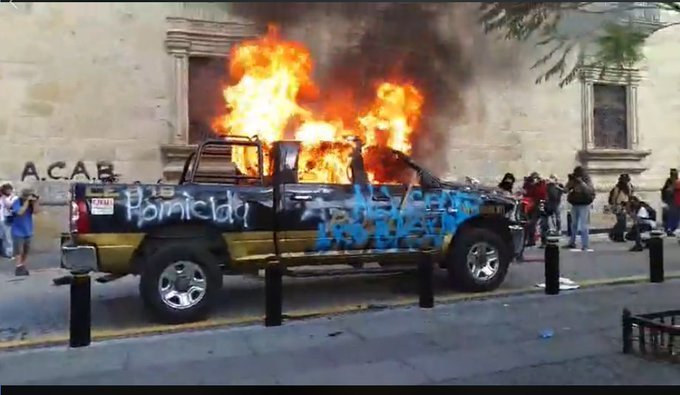 Después de graffitear los vehículos, un grupo de manifestantes les prendieron fuego y sacaron un arma larga que abandonaron en el piso. Durante algunos minutos se escucharon explosiones provenientes de las patrullas y los manifestantes se dispersaron en Plaza Liberación, detrás de la Catedral de Guadalajara.
