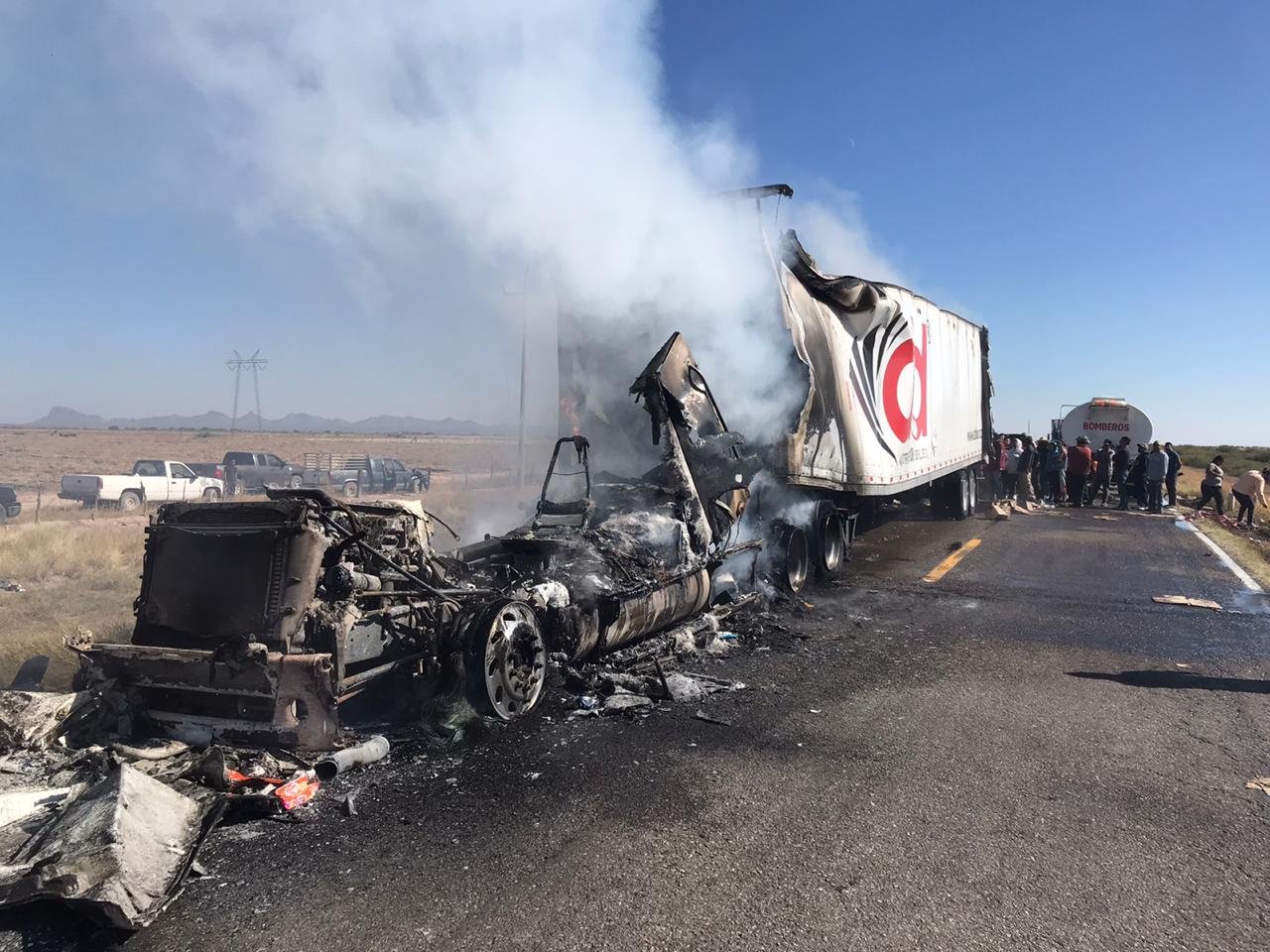 Esta tarde en el kilómetro 158 de la carretera Jiménez – Torreón se presentó un incendio de un tracto camión cargado con galletas.