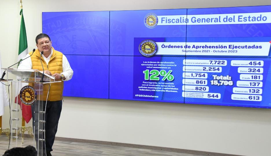 El titular de la dependencia dio a conocer que el total de órdenes de aprehensión ejecutadas durante el citado periodo es de 15,796 por diversos delitos, destacando en ello la detención de 7,722 personas por delitos contra la salud, así como la de 820 por homicidio y 132 por feminicidio.