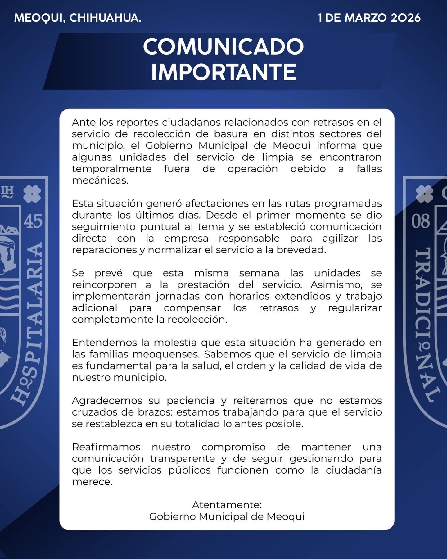 El Gobierno Municipal de Meoqui informó que los retrasos registrados en el servicio de recolección de basura en distintos sectores se deben a fallas mecánicas que dejaron temporalmente fuera de operación algunas unidades.