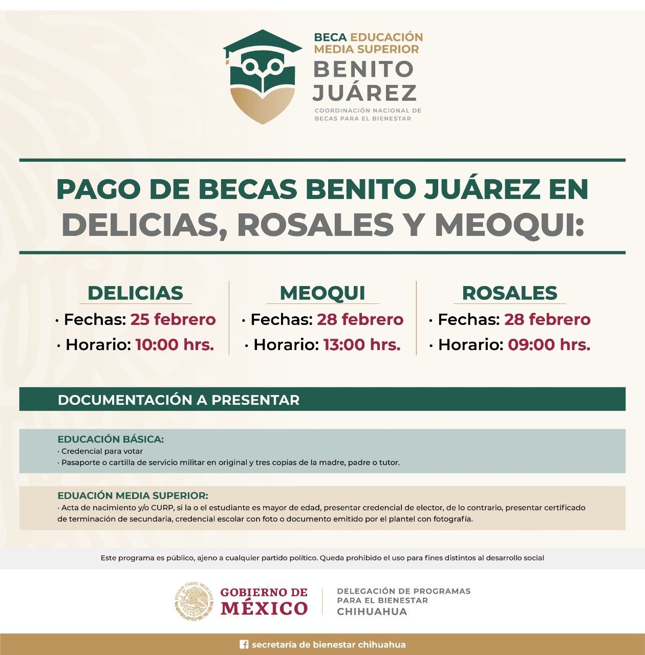 En lo que corresponde a la región Delicias, las y los becarios contarán con un depósito doble correspondiente a los bimestres febrero-marzo y abril-mayo, cuyo pago se efectuará del lunes 14 de febrero hasta el 25 de febrero en Delicias, y hasta el 28 del mismo mes en Meoqui y Rosales, en las sedes acostumbradas dependiendo de la localidad o municipio. El mes de enero no se contempla por ser periodo vacacional.