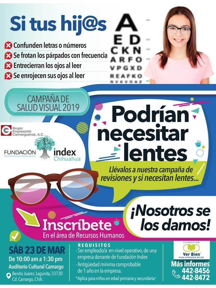 Camargo.- Como parte de las acciones que la empresa maquiladora realiza como una empresa socialmente responsable, este sábado 23 de marzo próximo, se realizará la campaña de Salud Visual 2019 en la que se entregarán lentes para hijos de trabajadores.