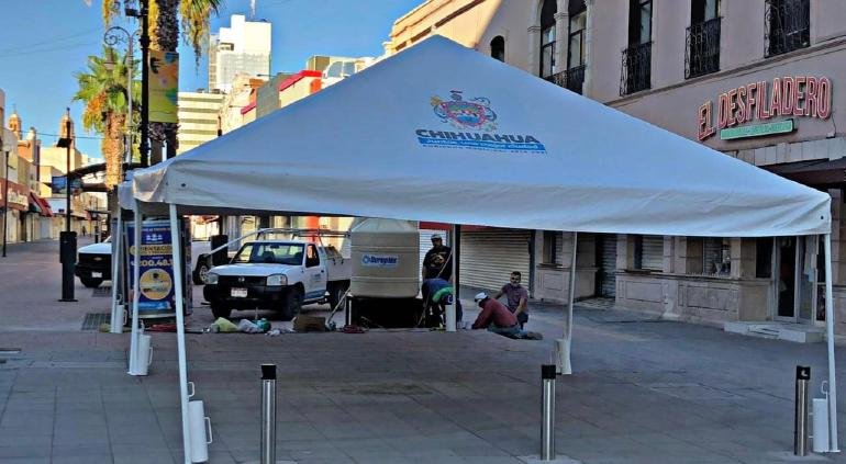 Desde temprano este viernes, 14 de agosto, personal del Municipio comenzó con la instalación de los filtros sanitarios en el Centro Histórico de la ciudad de Chihuahua.