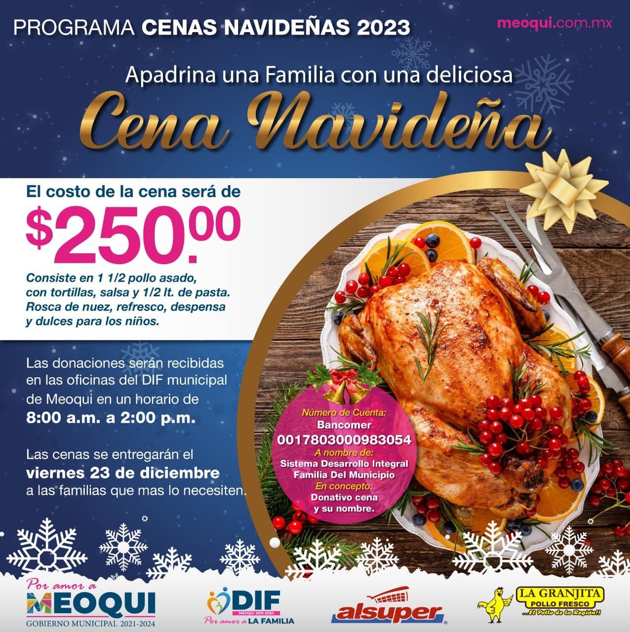 Pollo, espagueti, refresco, rosca, y tortillas, es lo que incluye la cena que el DIF Municipal de Meoqui estará entregando esta navidad a las familias meoquenses que más lo necesitan, es por ello que hicieron extensiva la invitación a la ciudadanía para que apoyen apadrinando a una familia con una cena navideña, la cual tendrá un costo de 250 pesos.