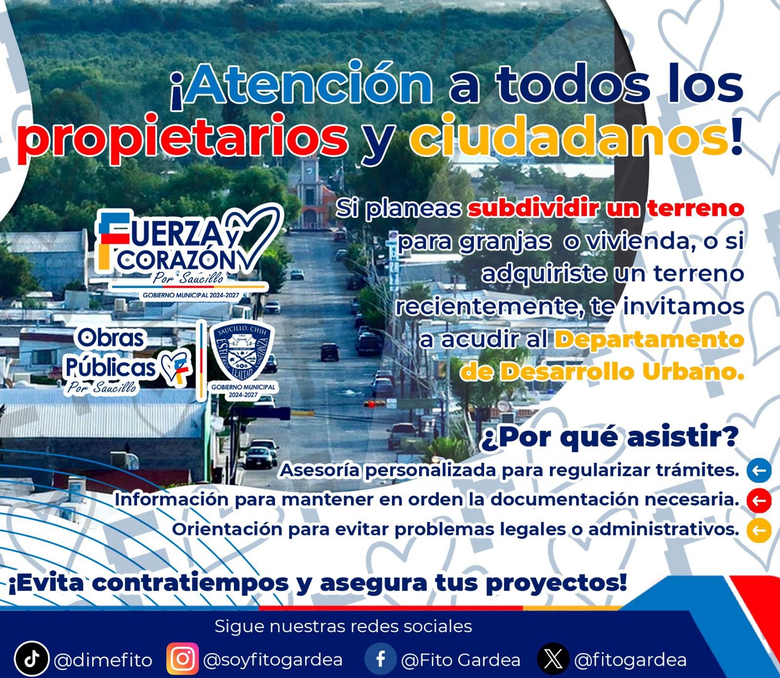El presidente municipal, en colaboración con la administración 2024-2027, hace un llamado a la ciudadanía para acudir al Departamento de Obras Públicas y Desarrollo Urbano, con el propósito de brindar asesoría personalizada a los propietarios de terrenos destinados a granjas o viviendas que deseen realizar el proceso de subdivisión.