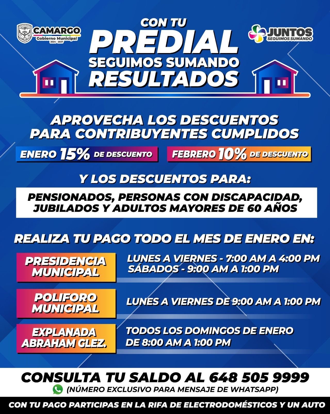El Gobierno Municipal de Camargo informa a la ciudadanía que ya se encuentran vigentes los descuentos por pronto pago del impuesto predial, invitando a las y los contribuyentes a aprovechar estos beneficios y cumplir de manera responsable.