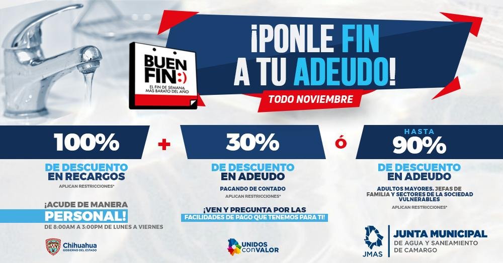 Camargo.- La Junta Municipal de Agua y Saneamiento encabezada por César Méndez se suma a las actividades del Buen Fin por tercer año consecutivo, programa que se implementa con la finalidad de ampliar horarios y servicios en beneficio de la comunidad que tiene adeudos, presentando descuentos para que regularicen su situación.