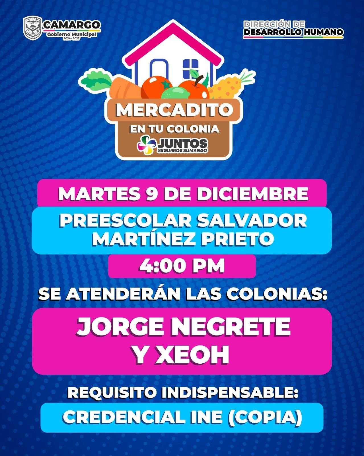 El Gobierno Municipal de Camargo, a través de la Dirección de Desarrollo Humano, invita al Mercadito en tu Colonia, una acción que seguimos impulsando para apoyar directamente a las familias con productos de despensa a bajo costo.