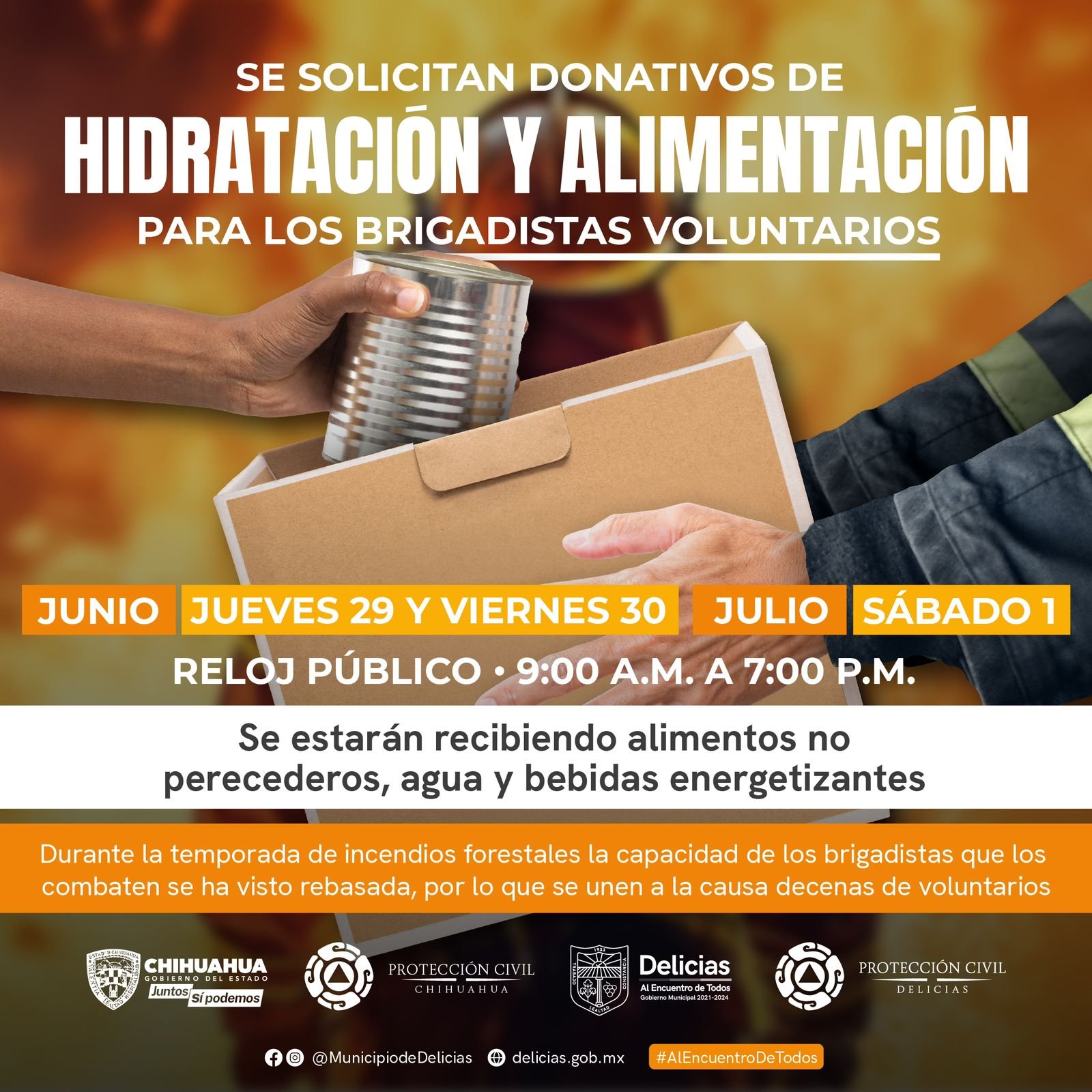 Con la intención de expresar el apoyo solidario de los delicienses, Protección Civil y Ecología invitan a la ciudadanía a apoyar a los brigadistas voluntarios que combaten el fuego en la Sierra de Chihuahua, a través de la recaudación de víveres.