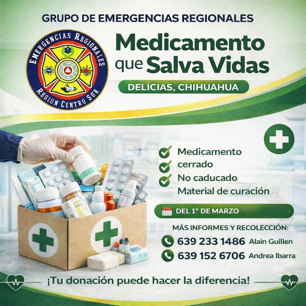 El Grupo de Emergencias Región Centro Sur puso en marcha la campaña “Medicamento que Salva Vidas” en la ciudad de Delicias, con el objetivo de recolectar fármacos y material de curación para apoyar a personas en situación vulnerable.