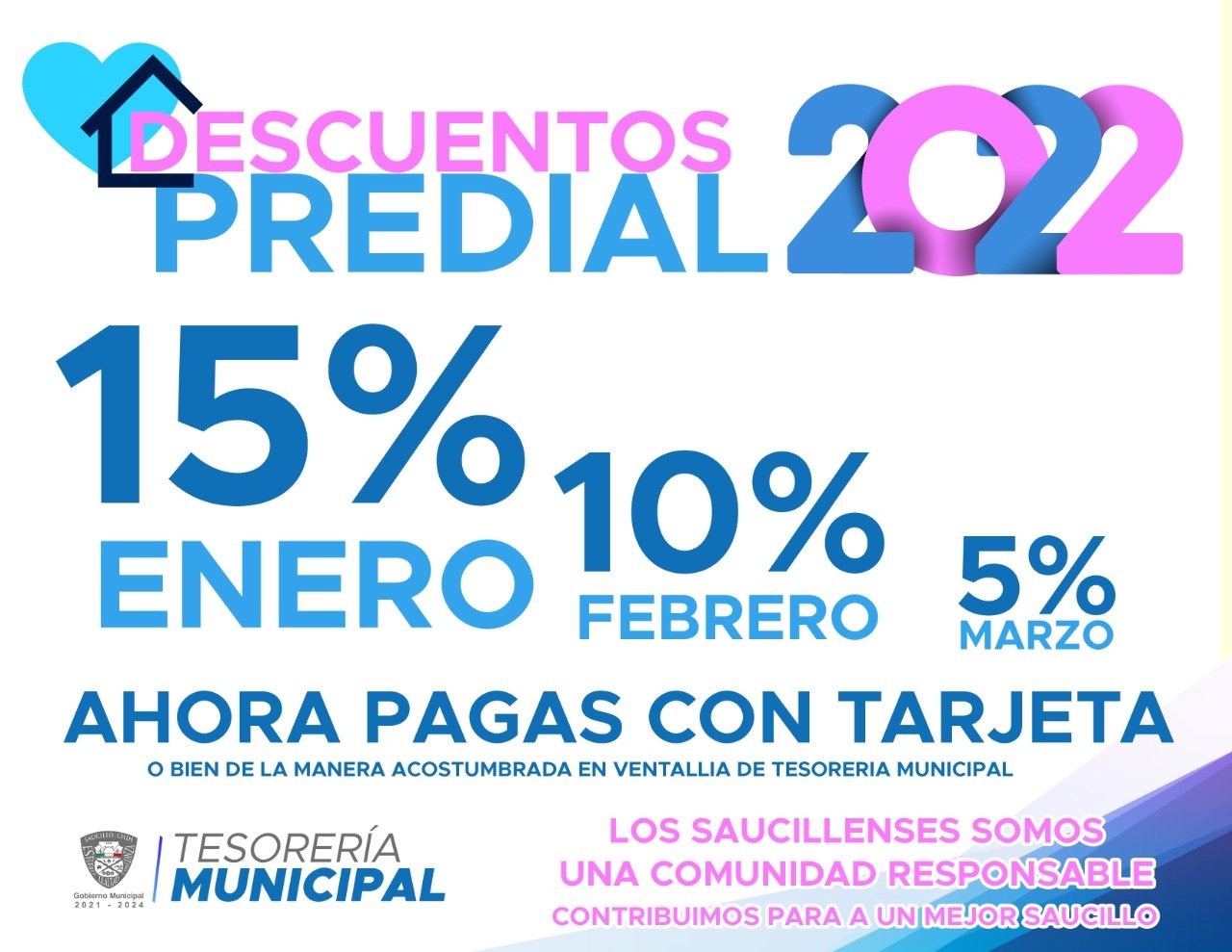La tesorería municipal invita a la ciudadanía a aprovechar el descuento del 15% en el pago del predial que estará todo este mes de enero.