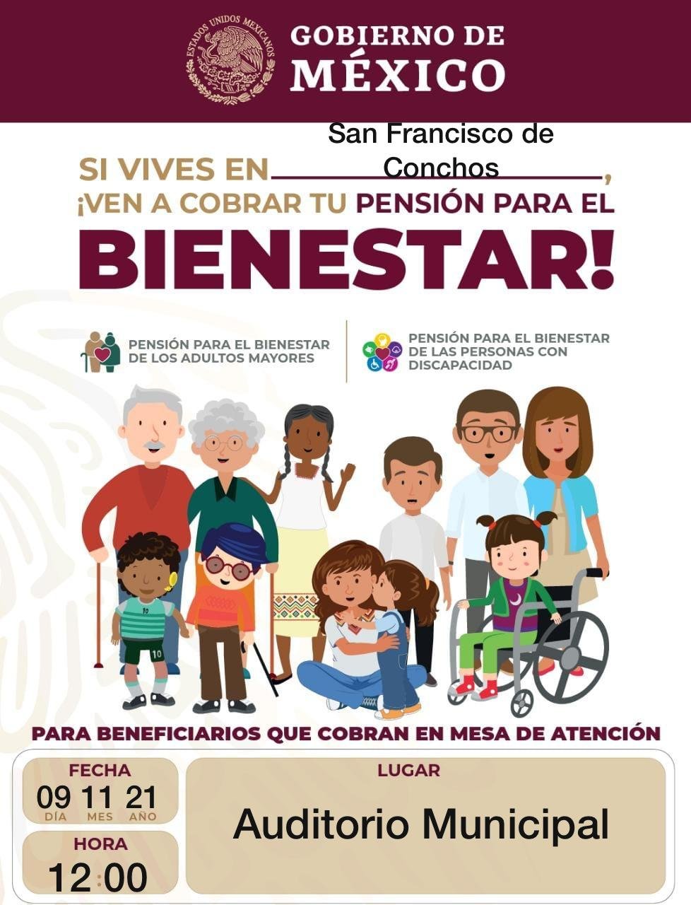 La secretaria de Bienestar, invita a la ciudadanía a cobrar pensión para el bienestar de adultos mayores y personas con discapacidad en el municipio de San Francisco de Conchos y en La Boquilla.