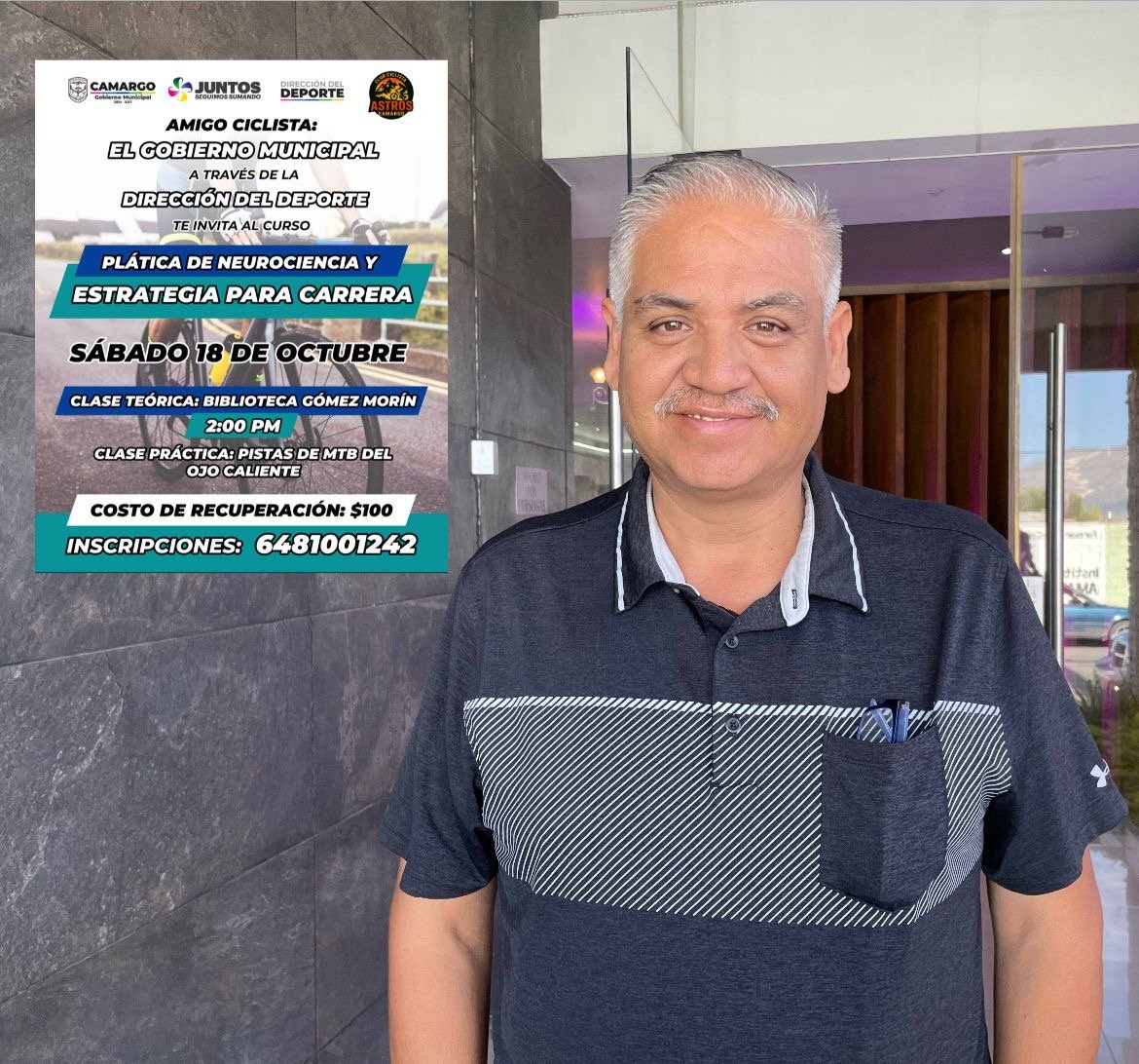 El Gobierno Municipal, a través de la Dirección del Deporte, invita a todos los corredores y ciclistas a participar en la plática de “Neurociencia y Estrategia para Carrera”, que se realizará este sábado 18 de octubre en la Biblioteca Gómez Morín a las 2:00 de la tarde.