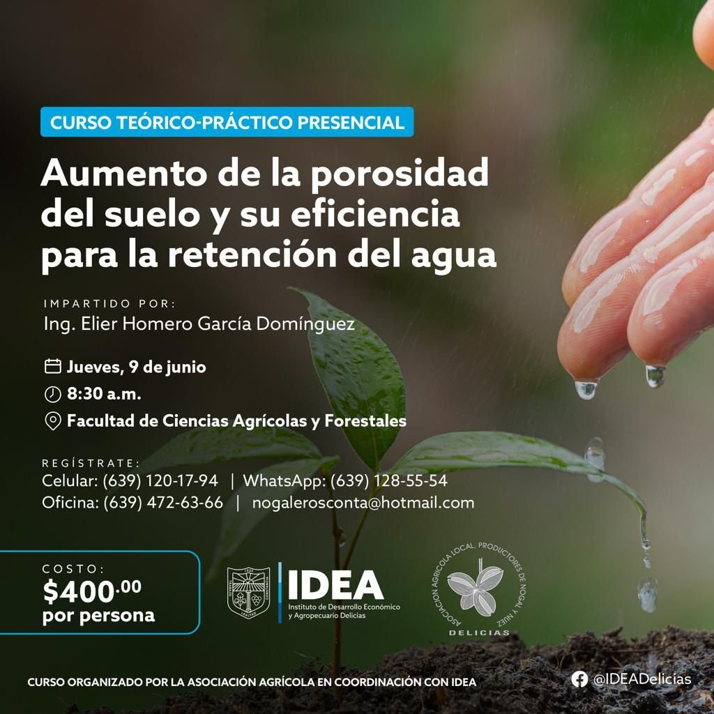 Presidencia Municipal de Delicias a través del Instituto de Desarrollo Económico y Agropecuario, invitan participar en el curso teórico- práctico sobre el aumento de la porosidad del suelo y su eficiencia para la retención del agua, que se llevará a cabo el jueves 09 de junio del año en curso.