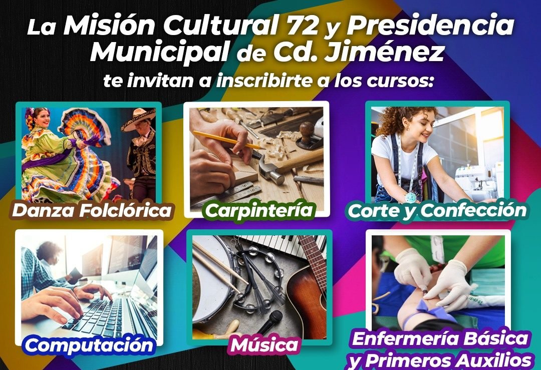 La presidencia municipal de Jiménez y la Misión Cultural 72 invitan a la ciudadanía a inscribirse a los cursos gratuitos que están ofreciendo.