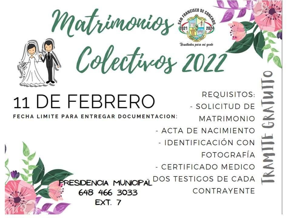Gobierno Municipal San Francisco de Conchos a través del Registro Civil, invita a todas las parejas que deseen contraer matrimonio a inscribirse y presentar sus documentos, para la celebración de los Matrimonios Colectivos 2022 el 14 de Febrero.
