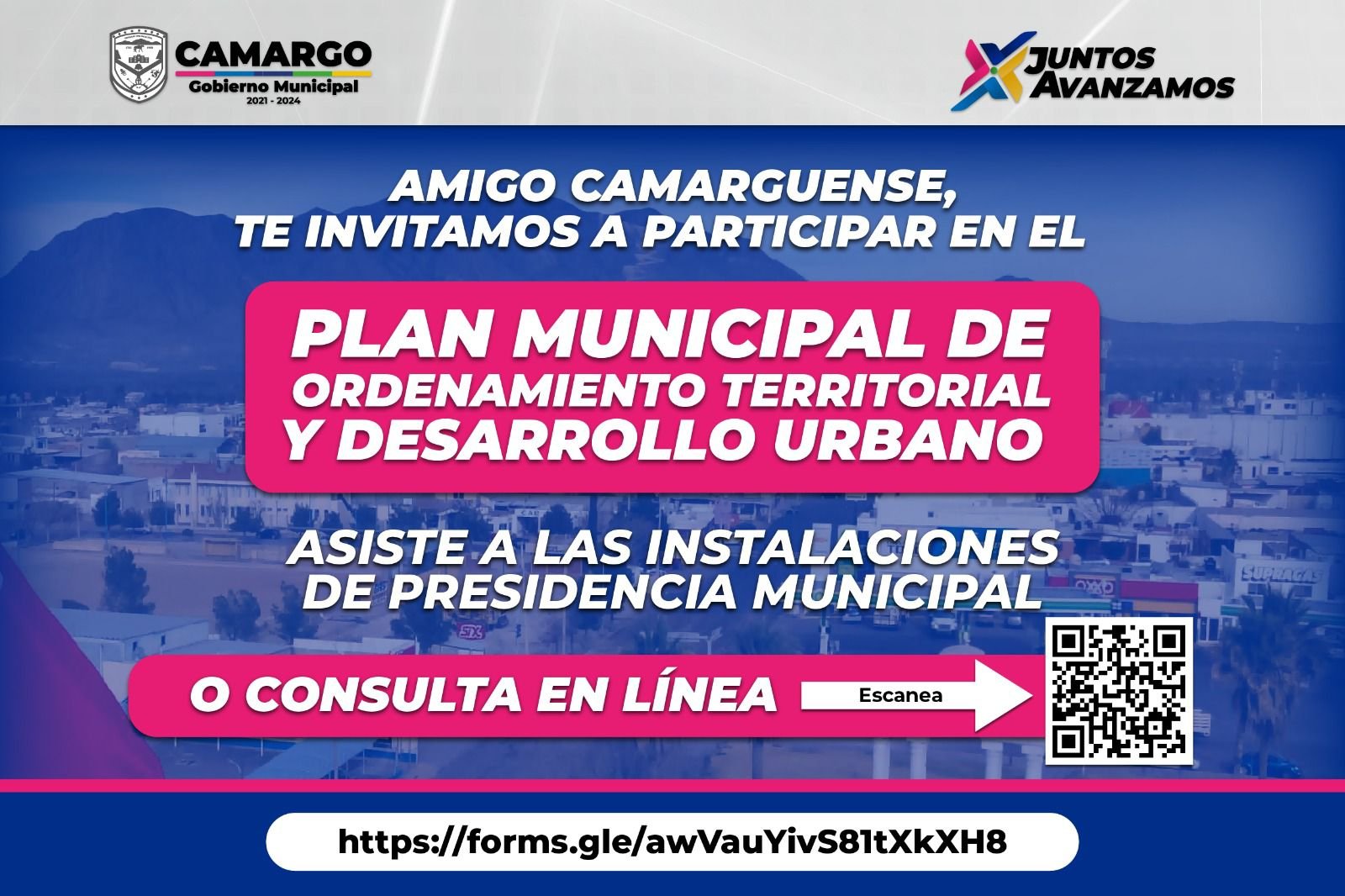 El Gobierno Municipal de Camargo invita a toda la comunidad a participar en la Consulta Pública para la elaboración del Plan Municipal de Ordenamiento Territorial y Desarrollo Urbano. Este proceso es fundamental para definir el futuro crecimiento y desarrollo de nuestra ciudad.