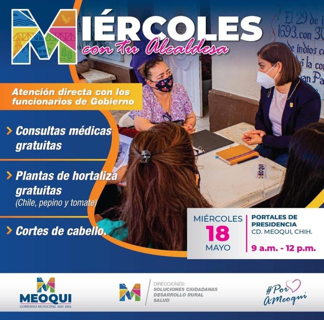 El gobierno municipal de Meoqui invita a toda la ciudadanía a acudir al “miércoles con tu alcaldesa” este próximo 18 de mayo.