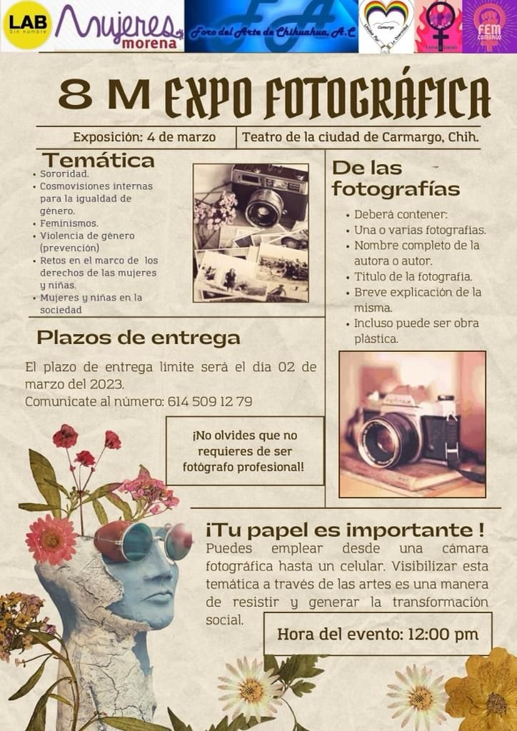 Con el objetivo de conmemorar el Día Internacional de la Mujer y visibilizar algunas de las problemáticas que se han vivido históricamente, diferentes colectivos feministas de Camargo están invitando a la comunidad en general a formar parte de “8M: EXPOSICIÓN FOTGRÁFICA”.
