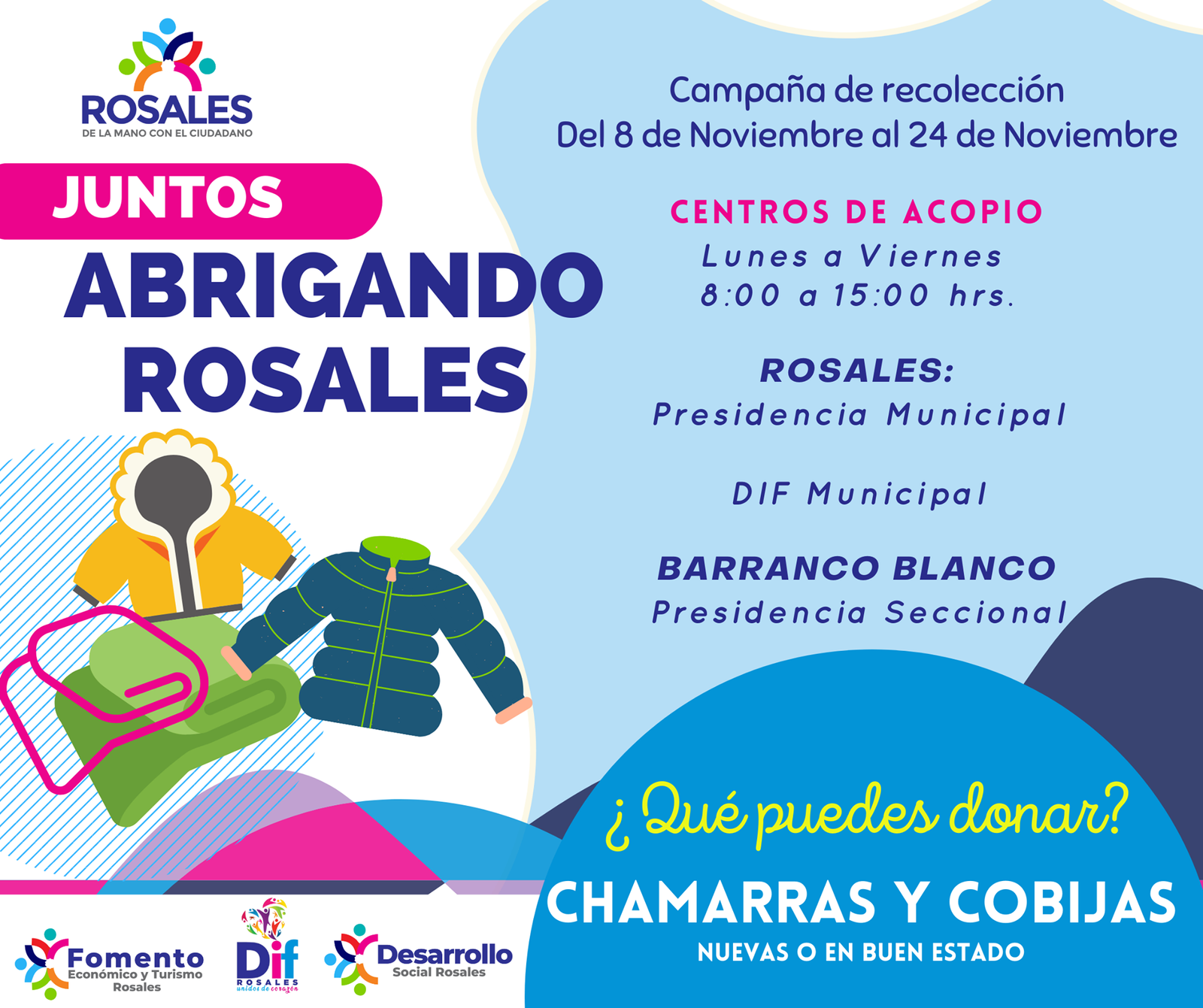Presidencia Municipal de Rosales invita a la ciudadanía a participar en la campaña de recolección de chamarras y cobijas “Juntos abrigando Rosales”.