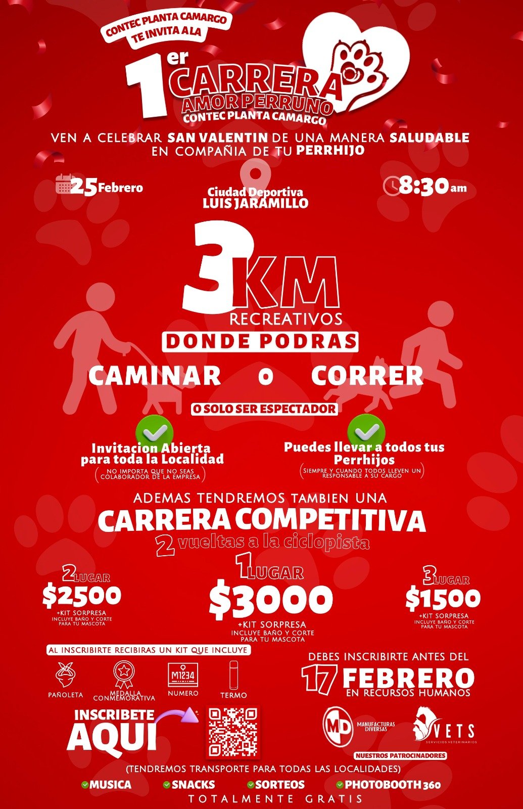 Contec planta Camargo invita a la ciudadanía a la primera carrera “Amor perruno”, una carrera para celebrar san valentín de manera saludable con tu perrhijo.