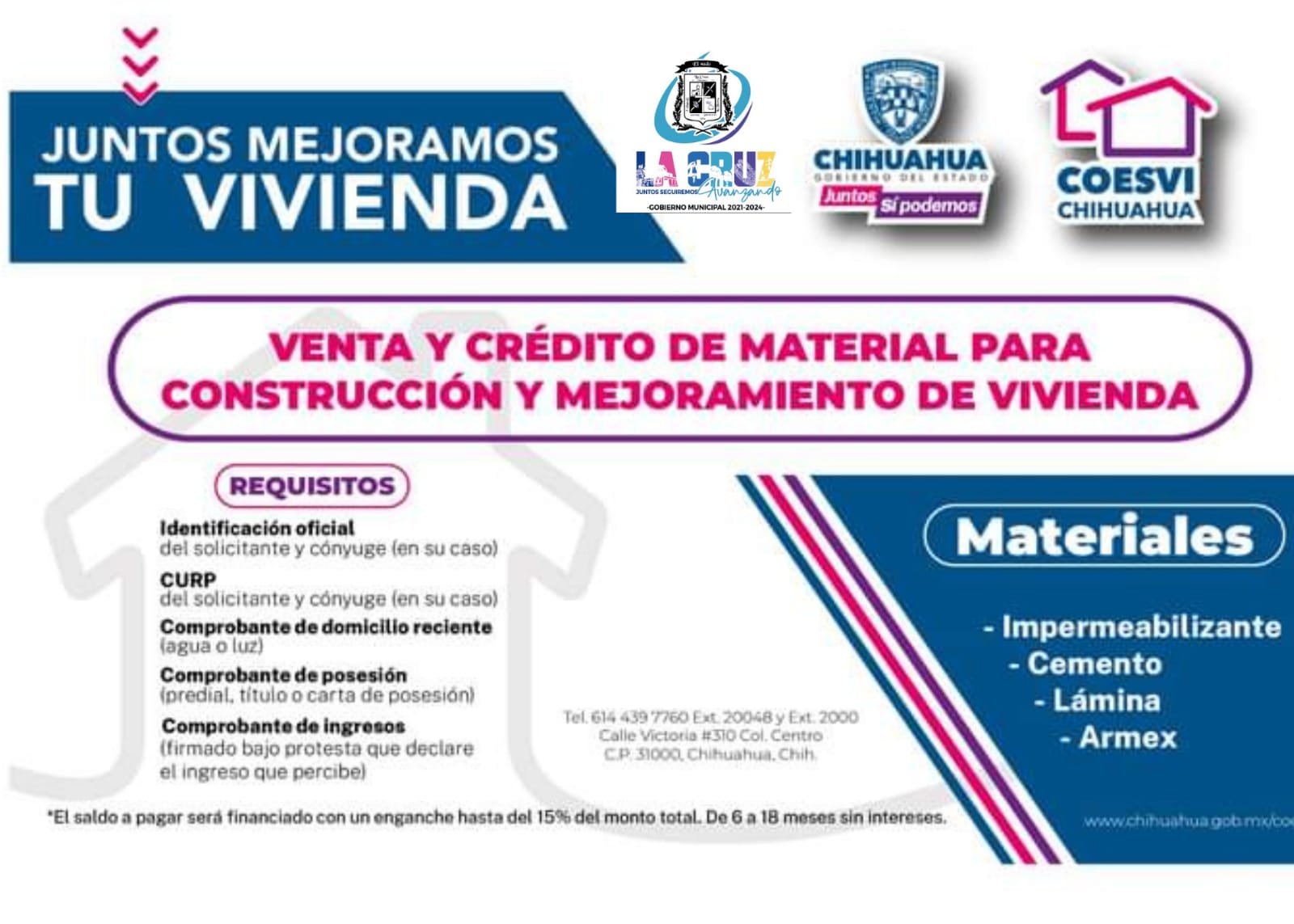 El Gobierno Municipal de La Cruz, en coordinación con la COESVI Chihuahua, invitó a la ciudadanía a participar en este programa de venta y crédito para construcción y mejoramiento de vivienda.