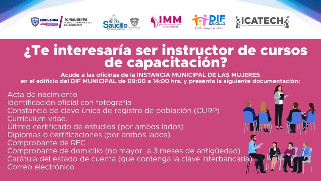 El gobierno municipal de Saucillo invita a la ciudadanía que este interesada a ser instructor de cursos de capacitación a acudir a las oficinas de la Instancia Municipal de las Mujeres.
