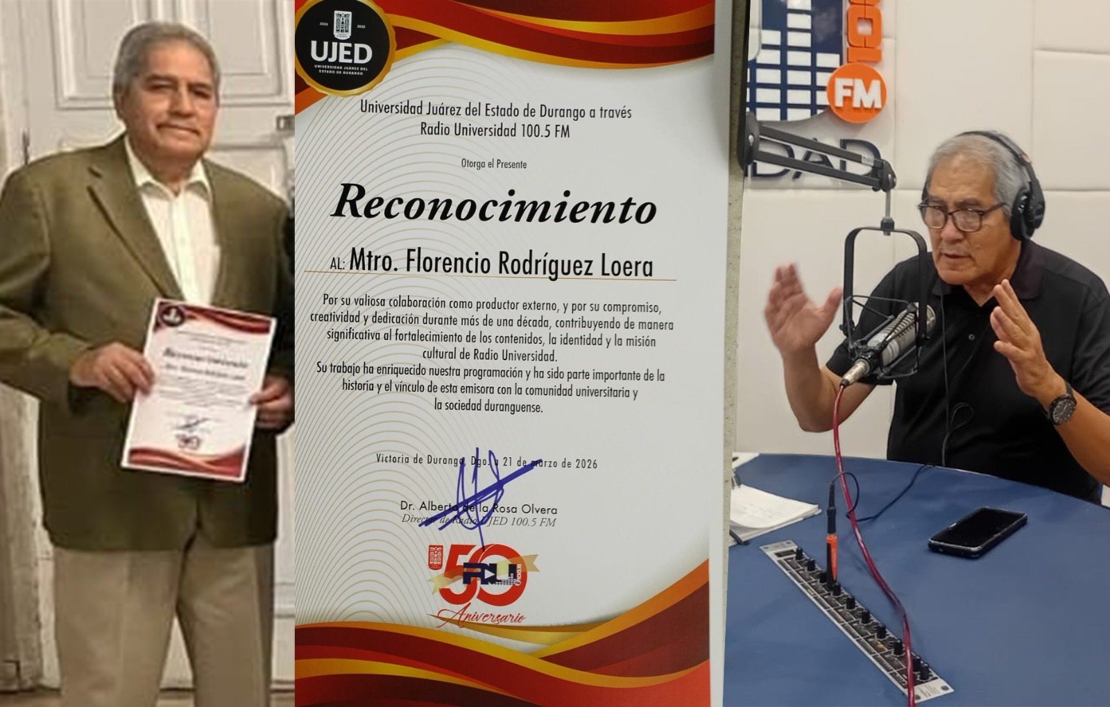 El Mtro. Florencio Rodríguez Loera, originario de Meoqui, Chihuahua, fue reconocido por la Universidad Juárez del Estado de Durango por su destacada trayectoria como productor y conductor de un programa radiofónico en Radio Universidad, labor que ha desempeñado durante más de una década.