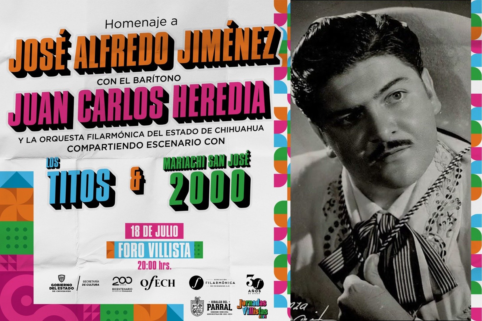En el marco de las Jornadas Villistas, la Secretaría de Cultura de Chihuahua invita al concierto “Homenaje a José Alfredo Jiménez”, que se llevará a cabo el jueves 18 de julio a partir de las 20:00 horas, en el Foro Villista de la ciudad de Parral.