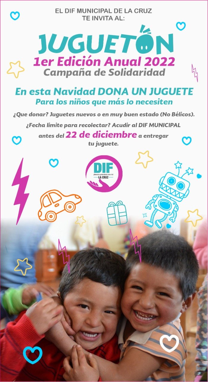 Hoy por parte del DIF Municipal de La Cruz encabezado por la señora Flor Silva Molina y la Lic. Katia Grimm Torres, dieron arranque al Jugeton 2022, donde lanzan la campaña de solidaridad para que la ciudadanía done juguetes NO BELICOS y asi apoyar a los niños que más lo necesiten.