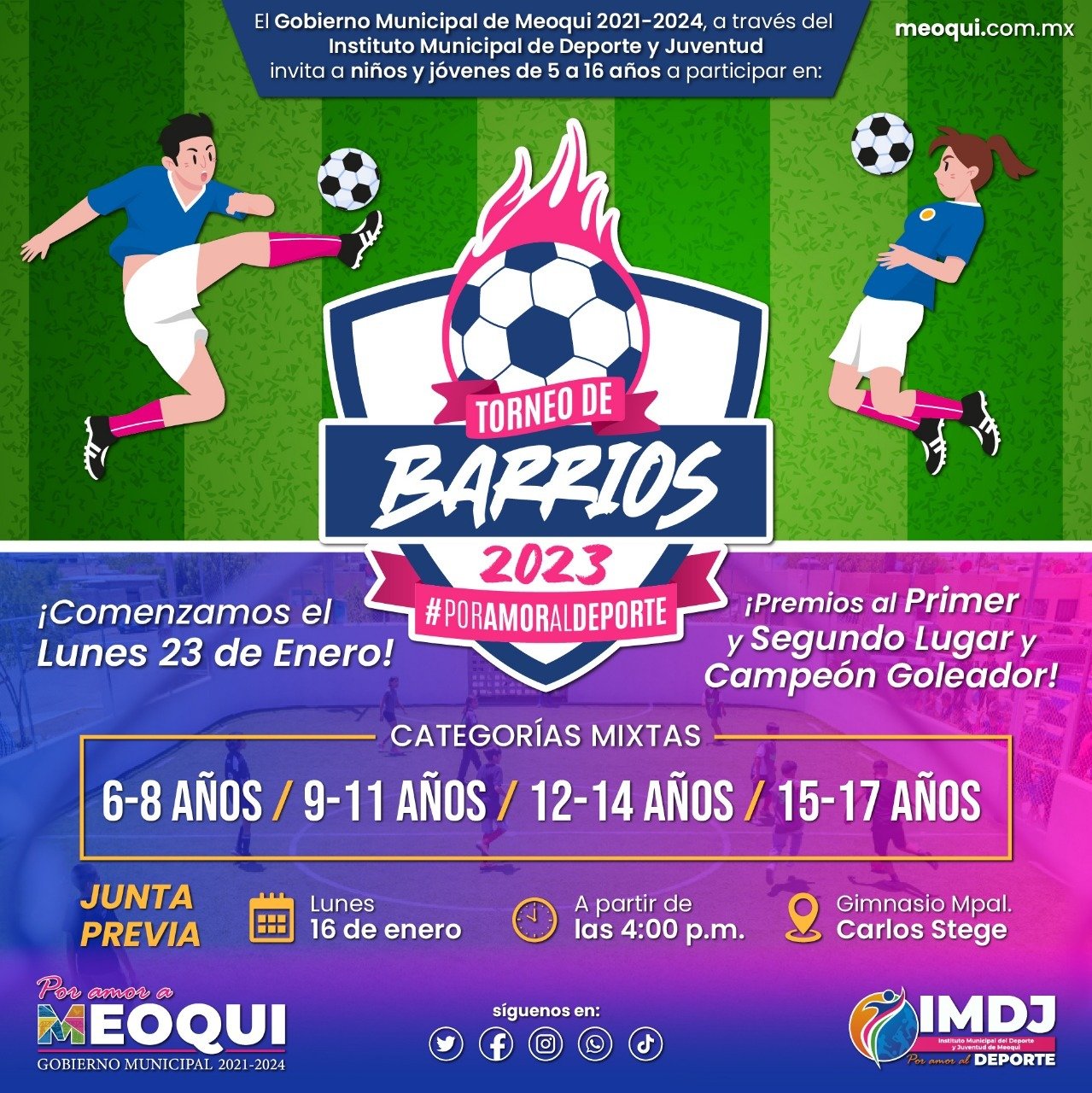 En Meoqui lanzaron la convocatoria para el Torneo de Barrios de Fútbol, en el cual podrán participar niños, niñas y adolescentes que tengan entre 6 a 17 años de edad, quienes competirán en cuatro categorías diferentes, es por ello que el Gobierno Municipal a través de la dirección del Instituto Municipal del Deporte y Juventud hacen extensiva la invitación para que se inscriban en la competición.