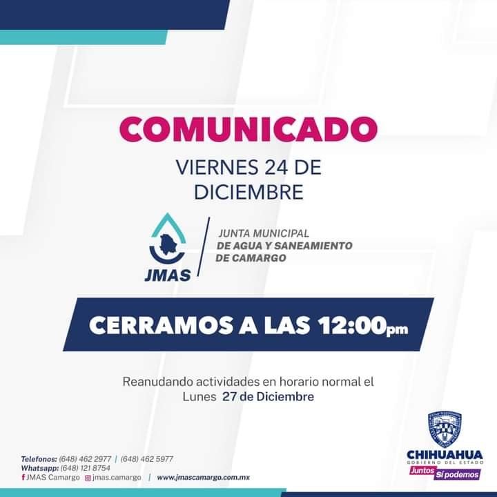 La Junta Municipal de Agua y Saneamiento atenderá a sus usuarios el 24 de diciembre hasta las 12 de la tarde.