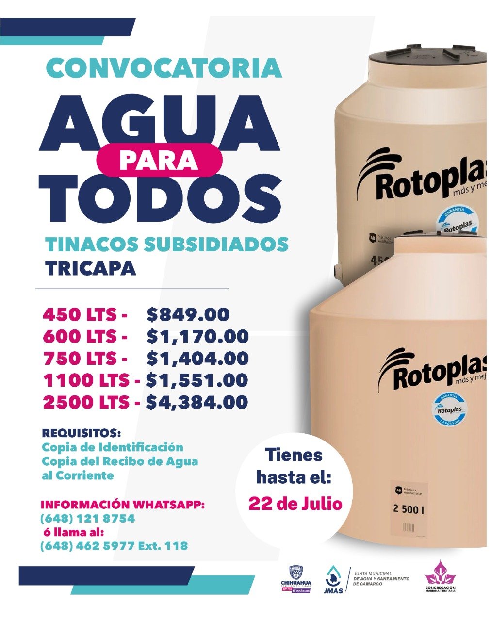 La Junta Municipal de Agua y Saneamiento de Camargo lanzó la convocatoria ‘Agua para todos’, en la que se ofrecen tinacos tricapa subsidiados.