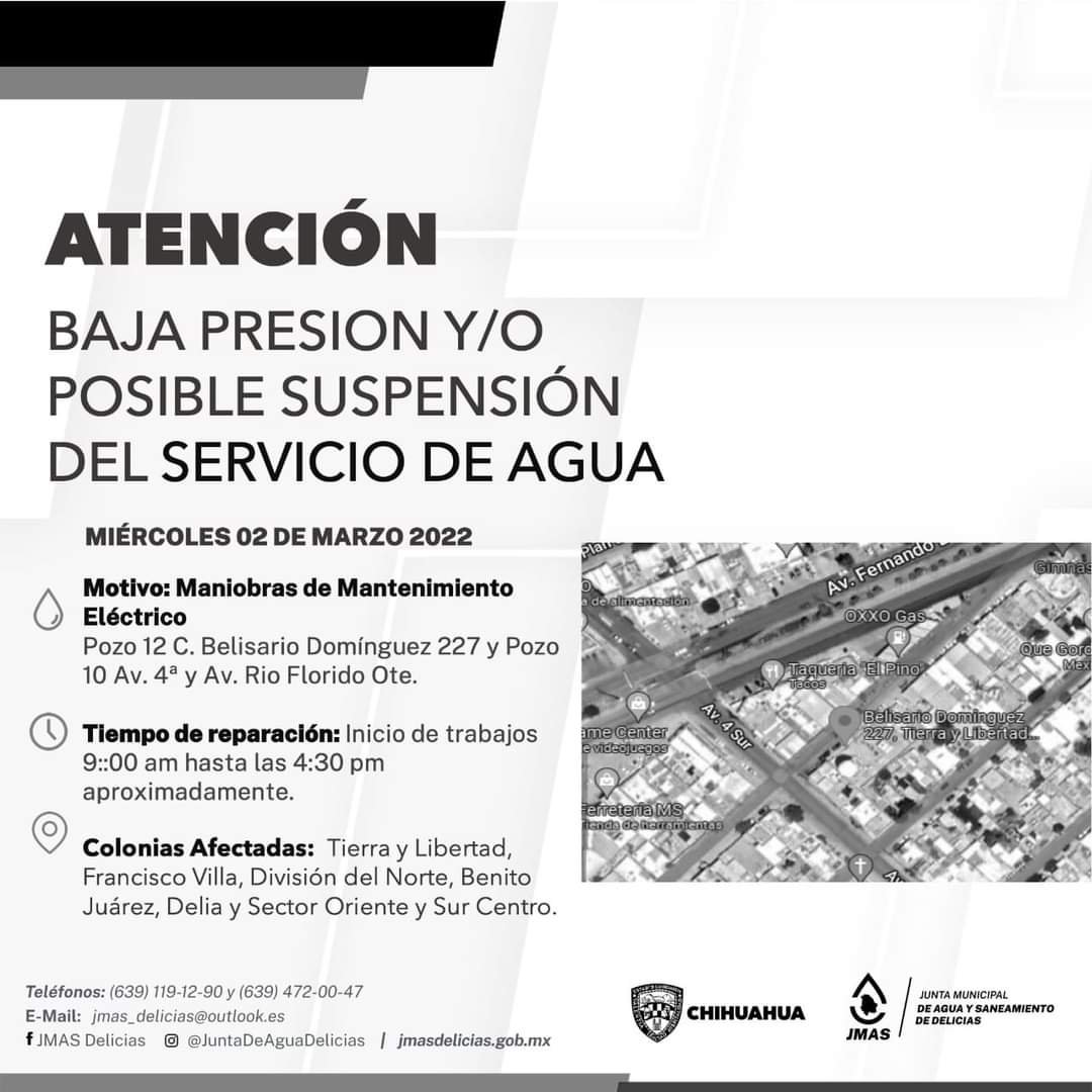 JMAS Delicias informa baja presión o suspensión del servicio por mantenimiento; afectará estas colonias
