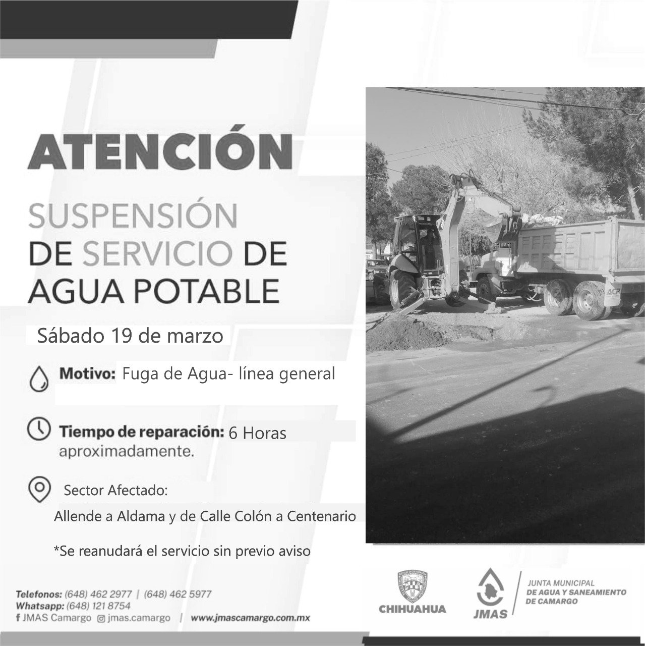 La Junta Municipal de Agua y Saneamiento de Camargo informó que este día suspenderá el servicio de agua potable.