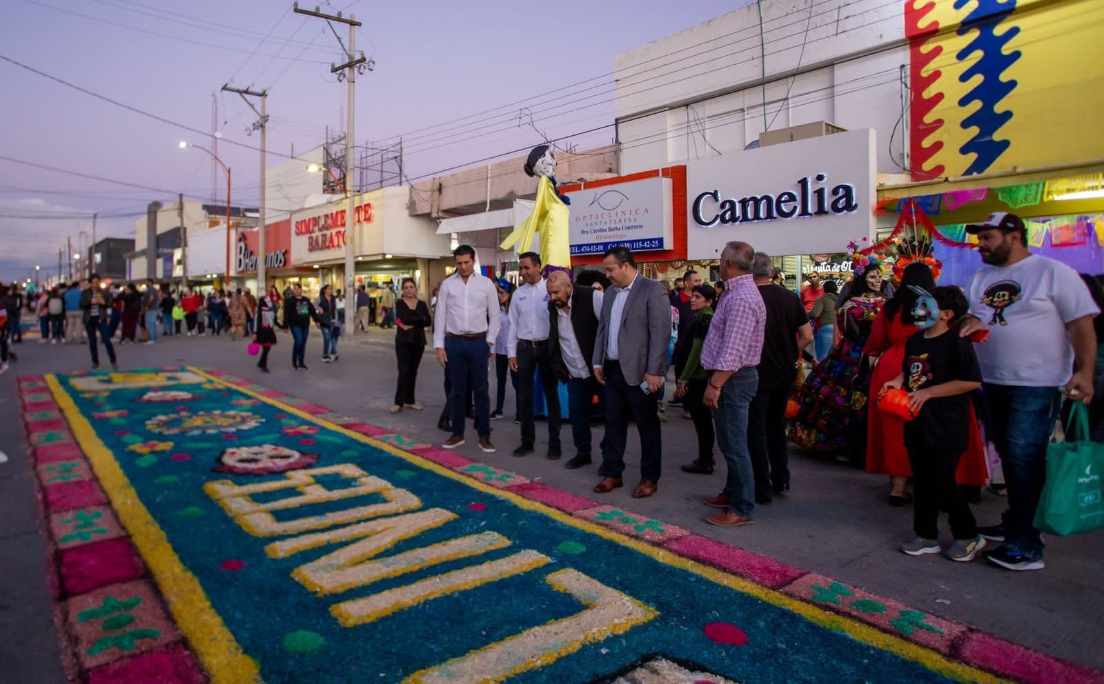 El Presidente Municipal, Jesús Valenciano, recorrió este lunes la icónica calle Tercera Norte, para disfrutar de la exposición de los tapetes monumentales como parte de las actividades programadas en el festival “Las Delicias de la Muerte”.