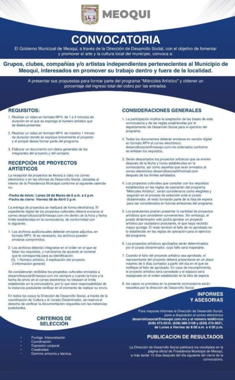 El Gobierno Municipal de Meoqui, a través de la Dirección de Desarrollo Social, convocó a grupos, clubes, compañías y/o artistas independientes a presentar propuestas para formar parte del programa “Miércoles Artístico”, esto en el marco del Día Mundial del Teatro.