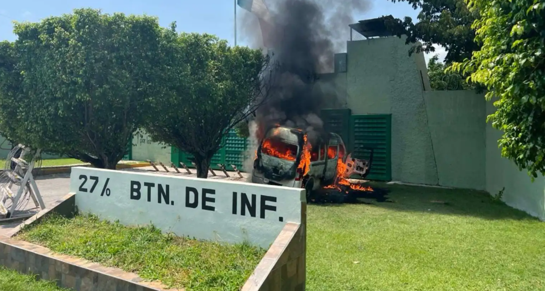En respuesta a esta acción, los encapuchados lanzaron petardos e incluso incendiaron una camioneta Urvan perteneciente a una tienda departamental a las puertas del cuartel militar.