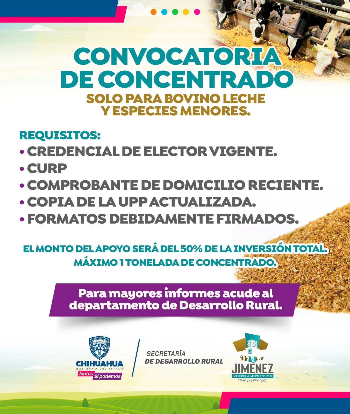 El Gobierno Municipal de Jiménez lanzó la convocatoria para apoyo de concentrado solo para bovino leche y especies menores.