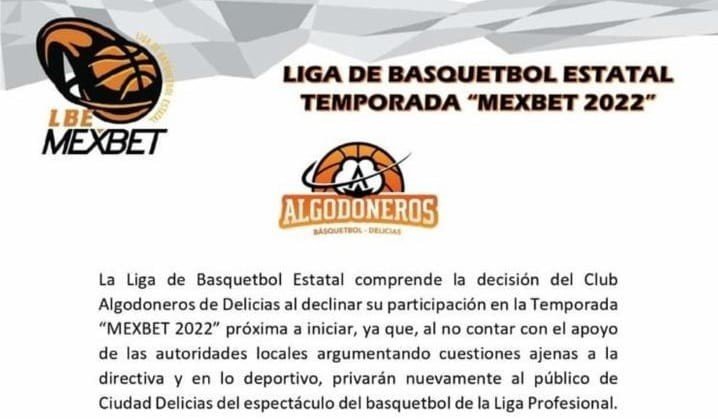 La Liga de Básquetbol Estatal (LBE), emitió un comunicado, en referencia a la decisión del equipo Algodoneros Basquetbol Delicias al declinar su participación en la Temporada “Mexbet 2022”.