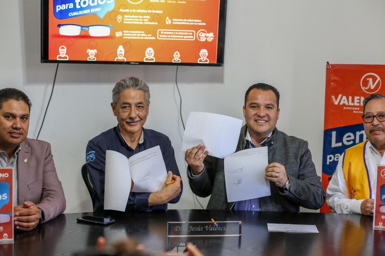Delicias.- “Este convenio de colaboración favorece a más de la mitad de personas que no pueden pagar unos lentes o que deben hacer mucho sacrificio para obtenerlos”, dijo el diputado Jesús Valenciano al signar dicho acuerdo.