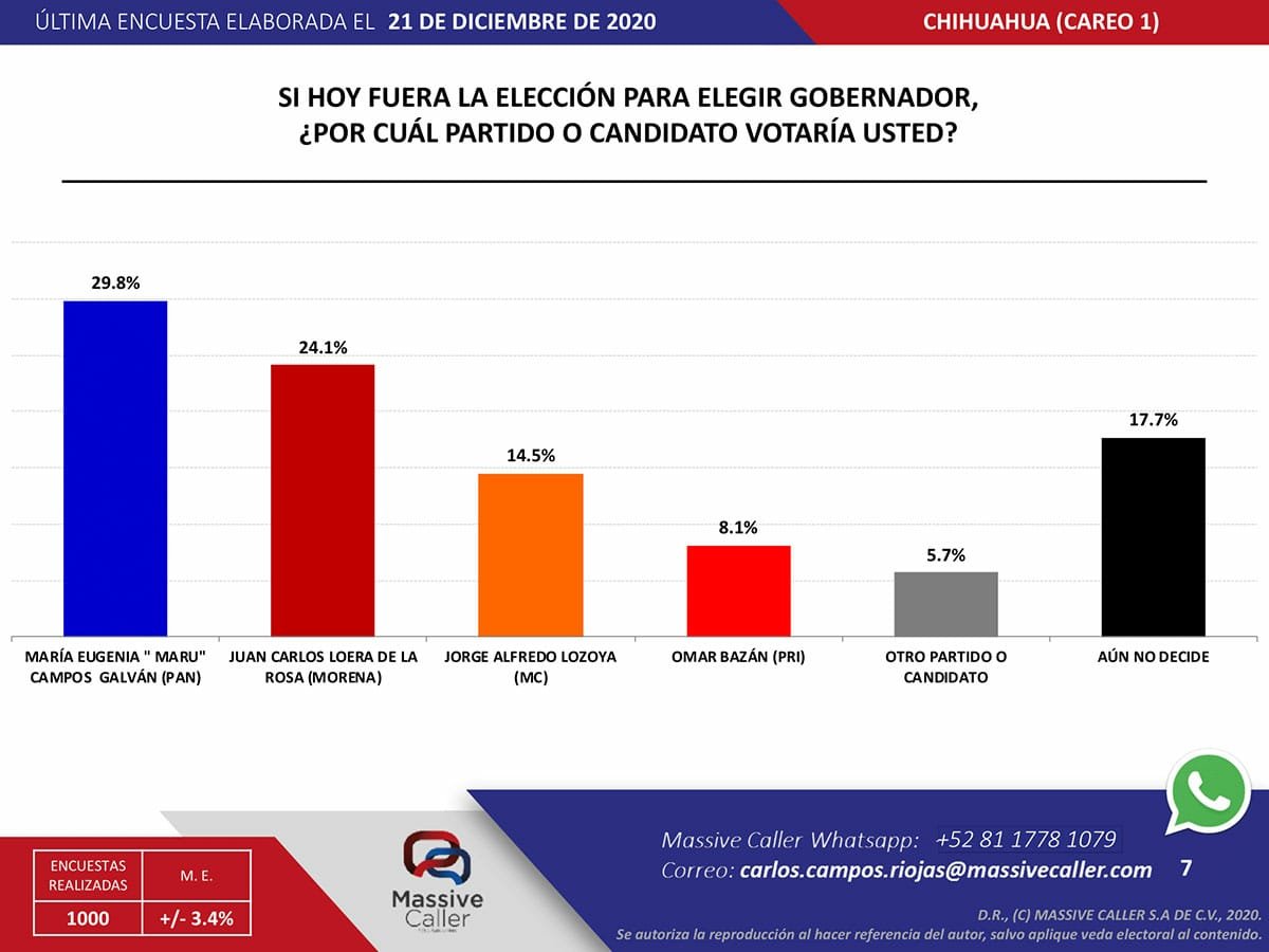 En la reciente encuesta de Massive Caller del mes de diciembre, la alcaldesa, Maru Campos una vez más se coloca como la única opción que puede vencer a Morena en la elección por la gubernatura del 2021.