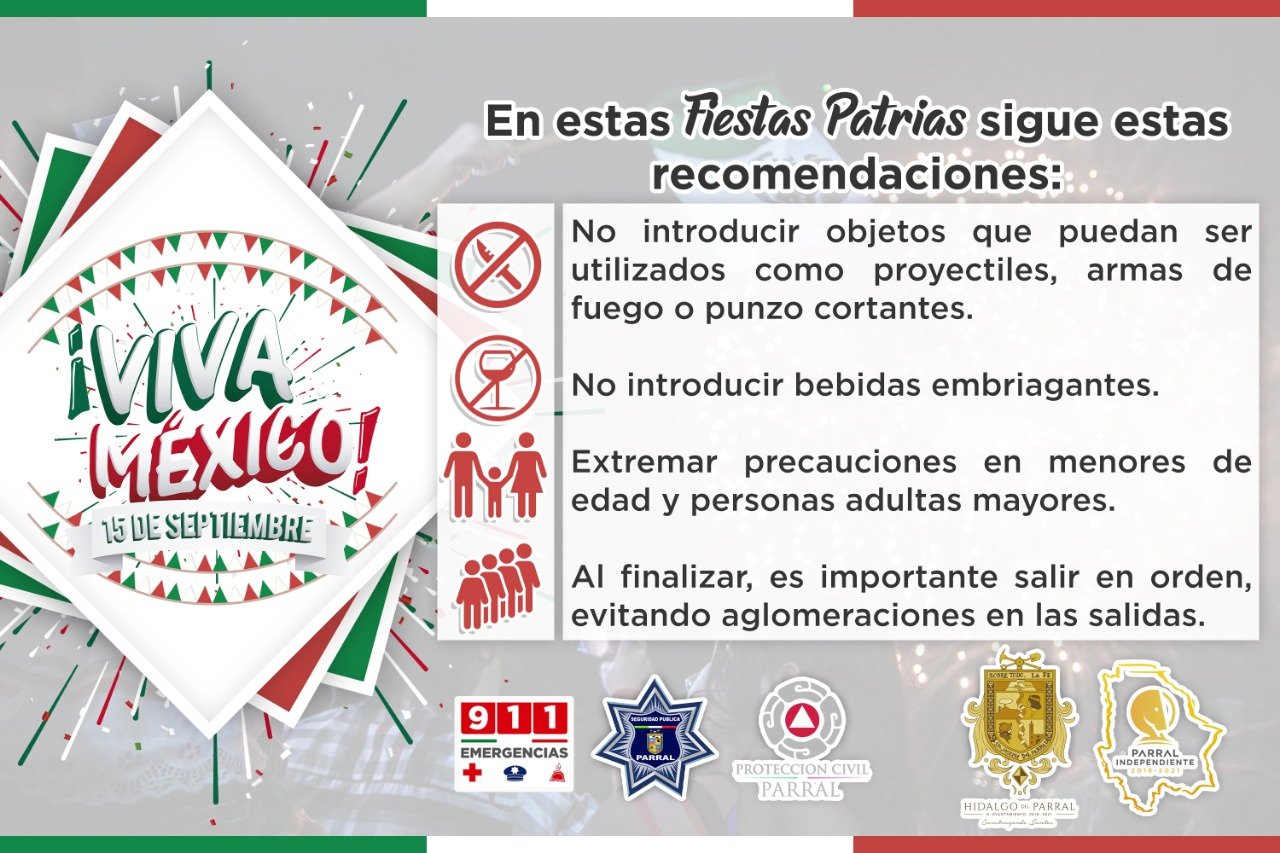 Parral.- La Dirección General de Seguridad Pública Municipal, invita a los ciudadanos a seguir las recomendaciones de prevención y seguridad para el festejo del Día de la independencia a celebrarse este domingo 15 por la noche y el desfile del 16 de septiembre.