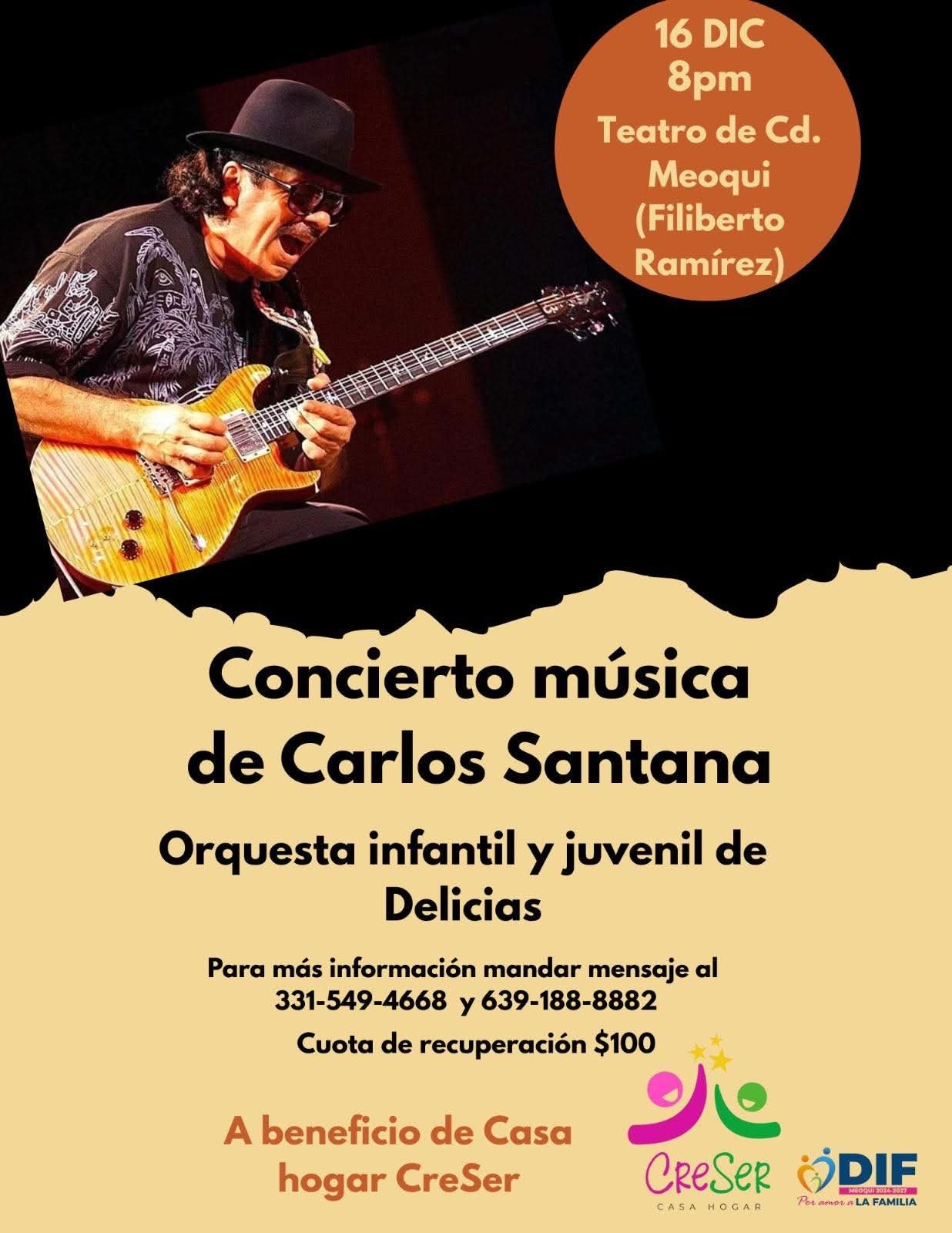 Este próximo 16 de diciembre a las 8 de la noche en el Teatro Filiberto Ramírez, el DIF Municipal de Meoqui, en coordinación con La Orquesta Infantil y Juvenil de Delicias, llevarán a cabo un Homenaje Sinfónico a Carlos Santana, donde los asistentes podrán disfrutar de éxitos como “Oye Como Va” “Black Magic Woman”, “Samba Pa Ti”, entre otras, el cual tendrá un costo de 100 pesos, todo esto en apoyo a la Casa Hogar Ceser.