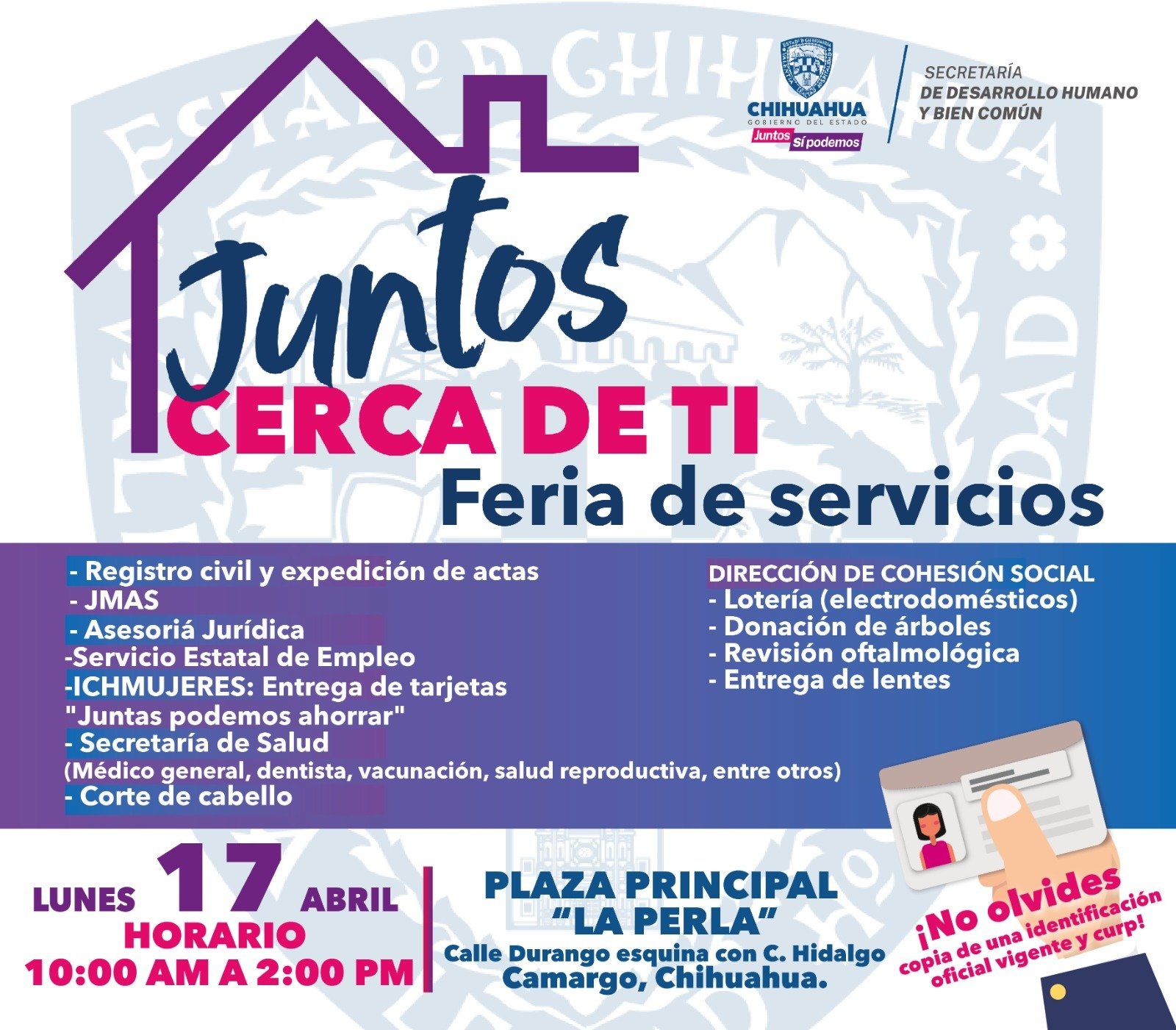 El presidente municipal, Jorge Aldana, confirmó la llegada del programa por parte del Gobierno del Estado “Juntos Cerca de Ti, Feria de Servicios” que organiza la Secretaría de Desarrollo Humano y Bien Común en coordinación con el Gobierno Municipal, además se contará con la presencia de la secretaria estatal Carla Rivas. El evento se llevará a cabo en la comunidad de La Perla el próximo lunes 17 de abril a partir de las 10 de la mañana.