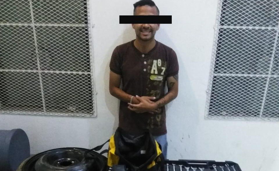 Vecinos del lugar dieron aviso a la dirección de seguridad pública municipal, toda vez que sorprendieron al sujeto robando un auto Aveo, color gris, logrando sustraer varios accesorios como una llanta extra, herramienta y accesorios.