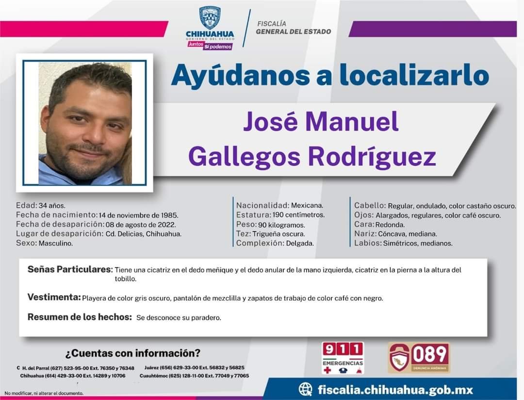 Desde ese momento se emitió la ficha a las corporaciones de la policía municipal para buscar a José Manuel Gallegos, de 34 años de edad.