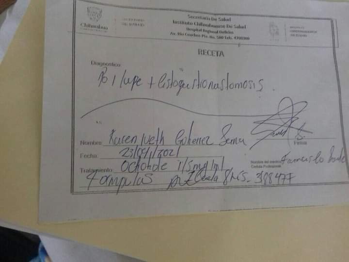 “Casi completamos una lo malo es que ahorita en la mañana le comenté al médico que ya mero completamos una, que sí mientras se la podían aplicar y me dice que no, ya que es un tratamiento y como tal se debe aplicar una ampolleta cada 8 horas entonces en verdad es muy impotente ver un hijo enfermo y no tener dinero aquí les dejare mi tarjeta si es su voluntad ayudarme Dios se los duplique mil gracias igual si alguien tiene el medicamento y me lo gusta donar o vender no importa mi hija lo necesita, ayúdenme por favor.”