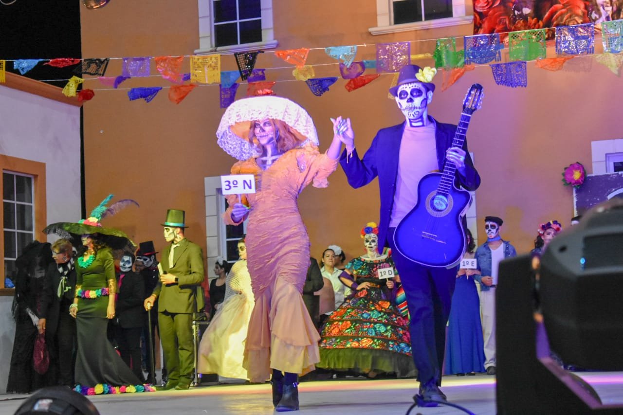 Parral.- En el marco del Festival de Día de Muertos se realizó la pasarela de Catrinas y Catrines del CBTis 228, en donde los estudiantes demostraron su gran talento en baile, música así como diferentes caracterizaciones.